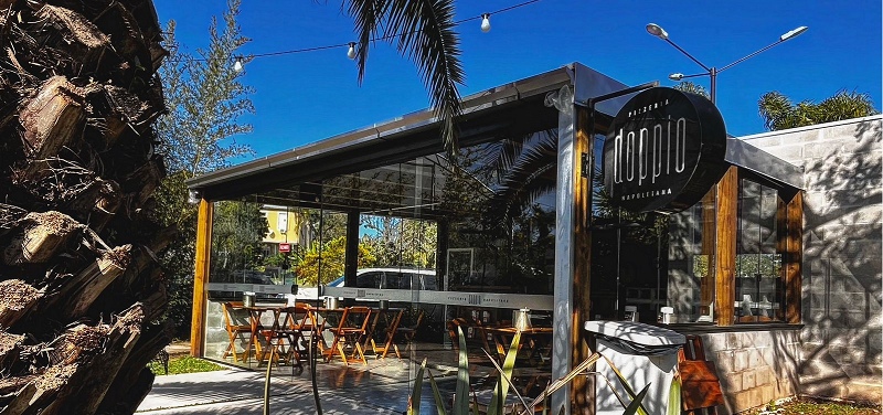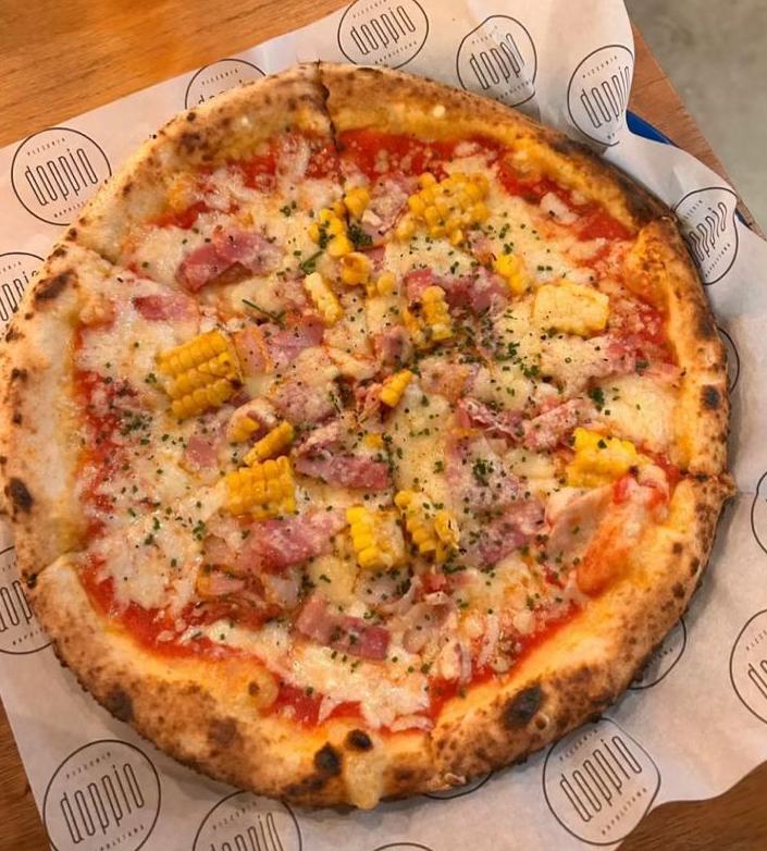 A famosa `Corn and bacon´. Base de molho de tomate, mozzarella de búfala, milho doce, bacon Ruppenthal e cebolinha verde