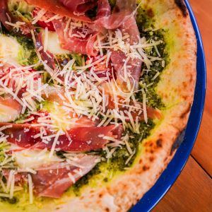Pizza com base de molho pesto, mozzarella de búfala fresca, tomate cereja, prosciutto crudo e parmesão