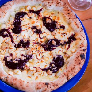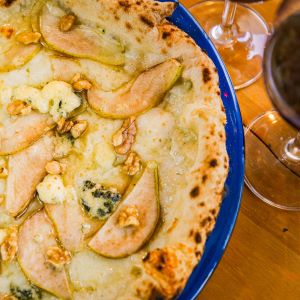 Base bianca, mozzarella de búfala, gorgonzola, pêra, nozes e mel