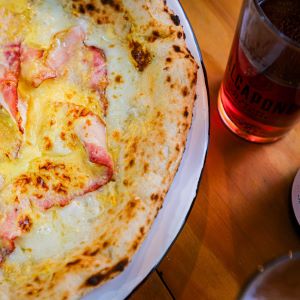 Base bianca, mozzarella de búfala, parmesão, creme de gemas, pimenta do reino e bacon