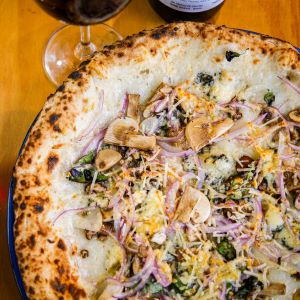 Base bianca, cogumelos Portobello, gorgonzola, alho confitado, cebola roxa, parmesão e azeite de oliva