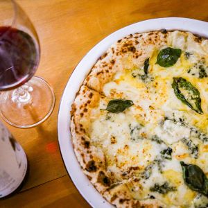 Base bianca, mozzarella de búfala, gorgonzola, provolone, parmesão e manjericão