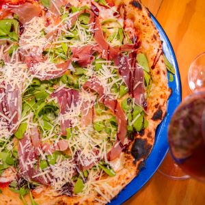 Molho de tomate italiano, mozzarella de búfala, presunto cru, rúcula, parmesão