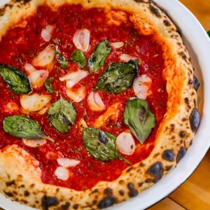 Molho de tomate italiano, mozzarella de búfala fresca, manjericão, parmesão e azeite de oliva