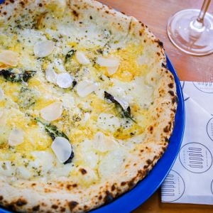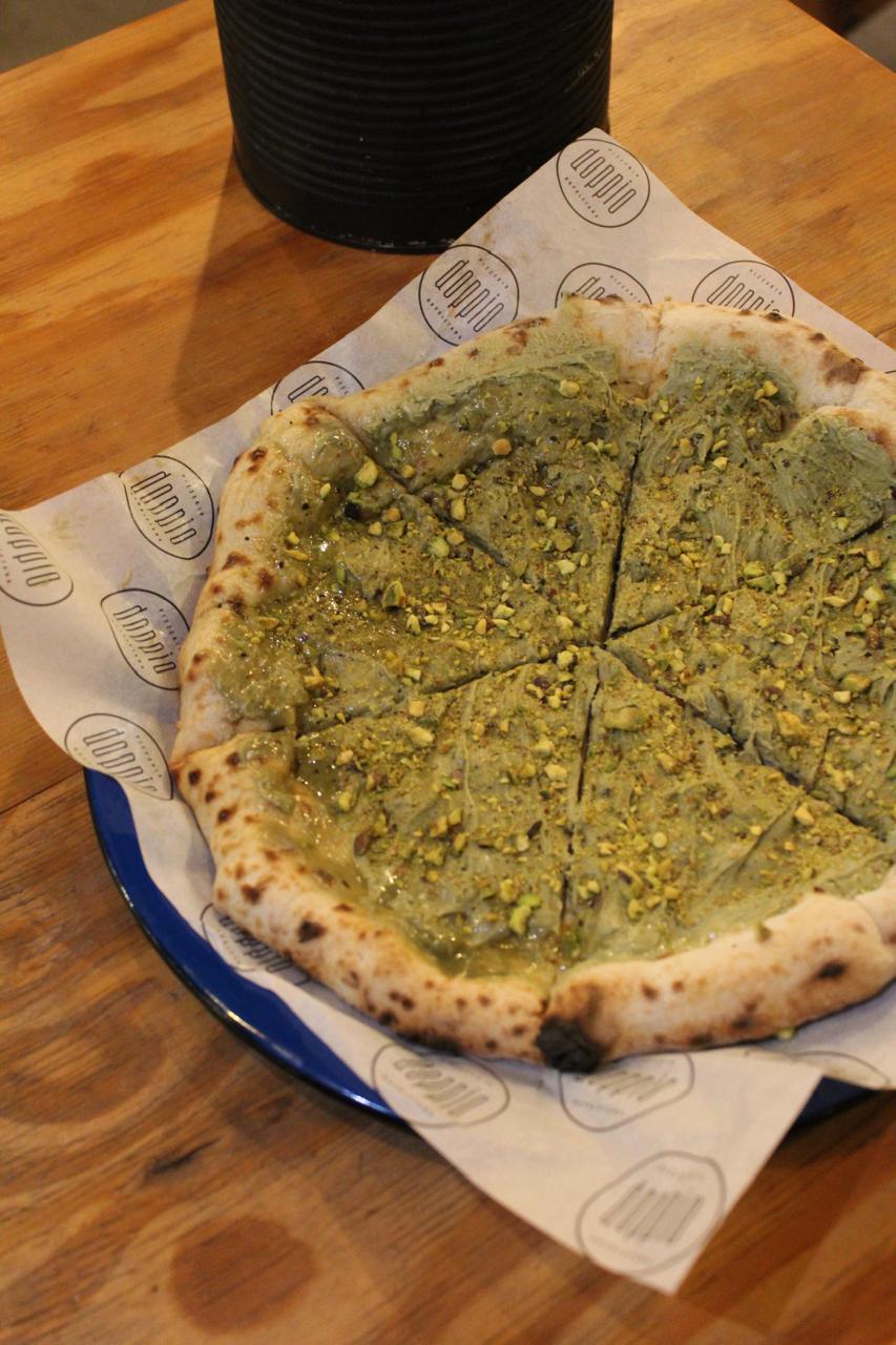 Ela está de volta: Pizza com molho de tomate, mozzarella de búfala, abobrinha, queijo de cabra, raspas de limão siciliano, pistache e parmesão